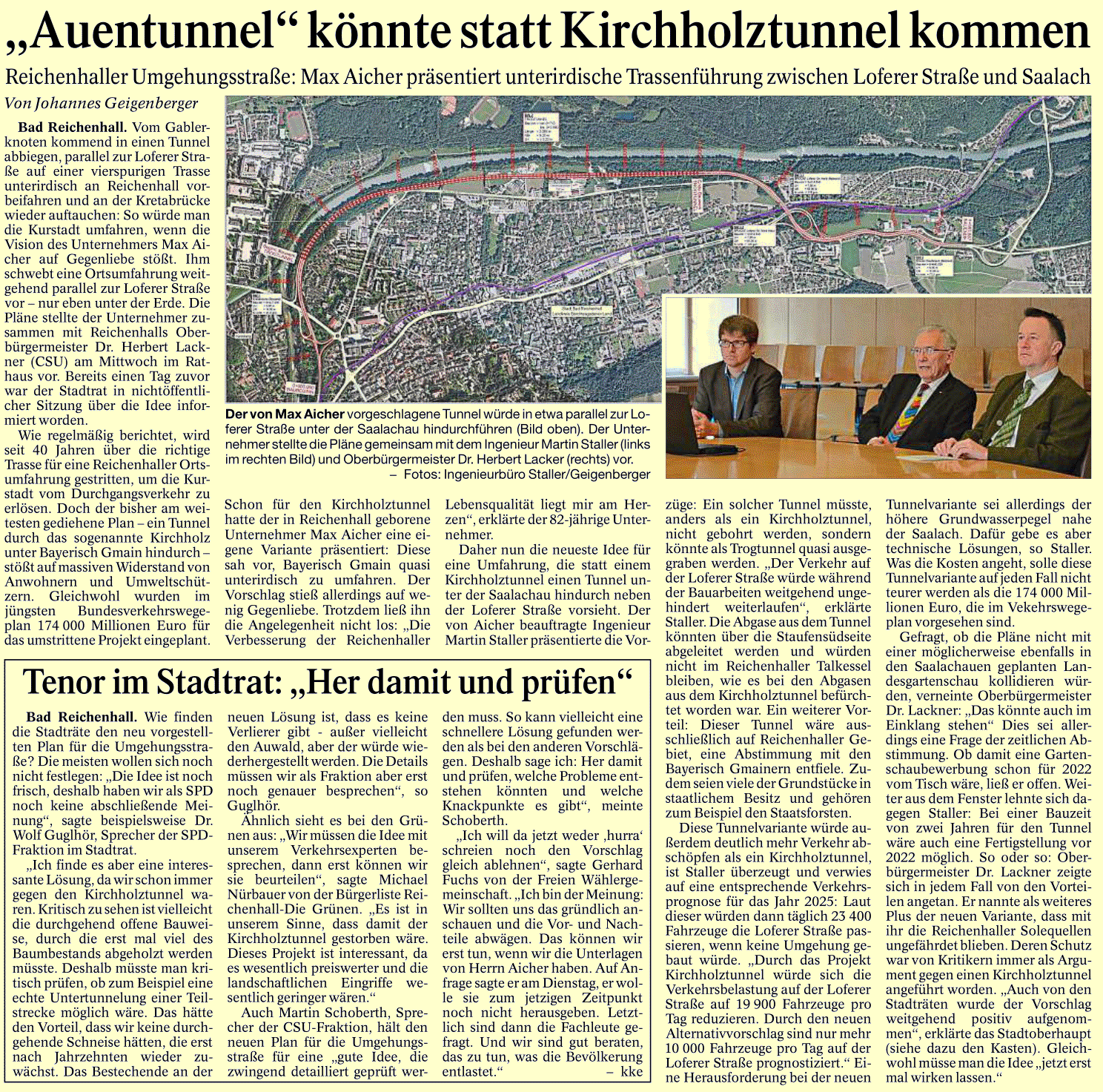 Ebenfalls am 18.03.2016 berichtet Johannes Geigenberger auf der Reichenhaller Regionalseite über die wieder aufflammende Diskussion zum Kirchholztunnel. Das Bild im Artikel zeigt zwei Varianten, eine war nie Gegenstand des Verfahrens, es war die Aicher-Idee. Als Herkunftsnachweis ist dazu "Staatliches Bauamt" angegeben. Es wird ja nicht das staatliche Bauamt Palermo sein?